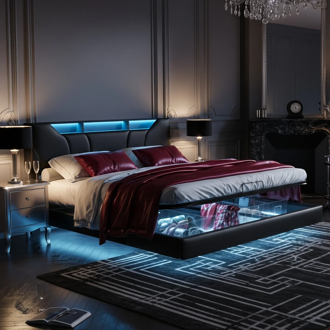 MGMYM Lit double 140/160x200 avec hydraulique, LED RGB, USB/USB-C et tête de lit rembourrée en velours – cadre métal,Lit coffre