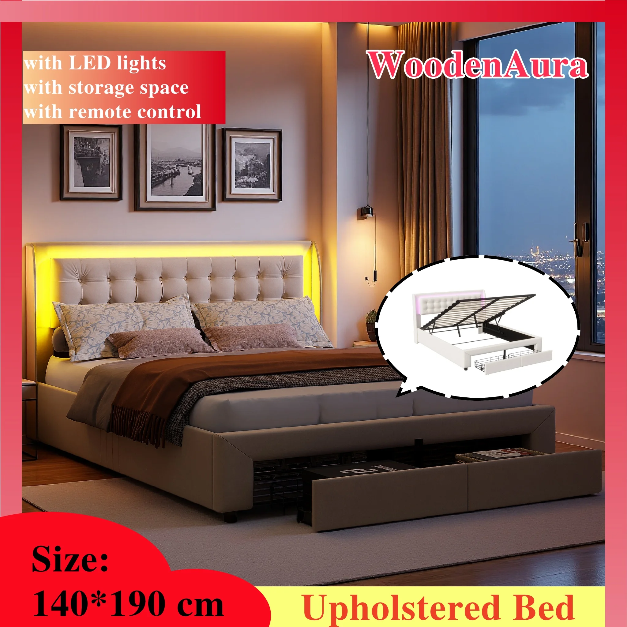WOODENAURA Lit de rangement 140x190 cm avec système de levage hydraulique, doté de 2 tiroirs et lit rembourré à éclairage LED, lit de jeunesse, lit à lattes