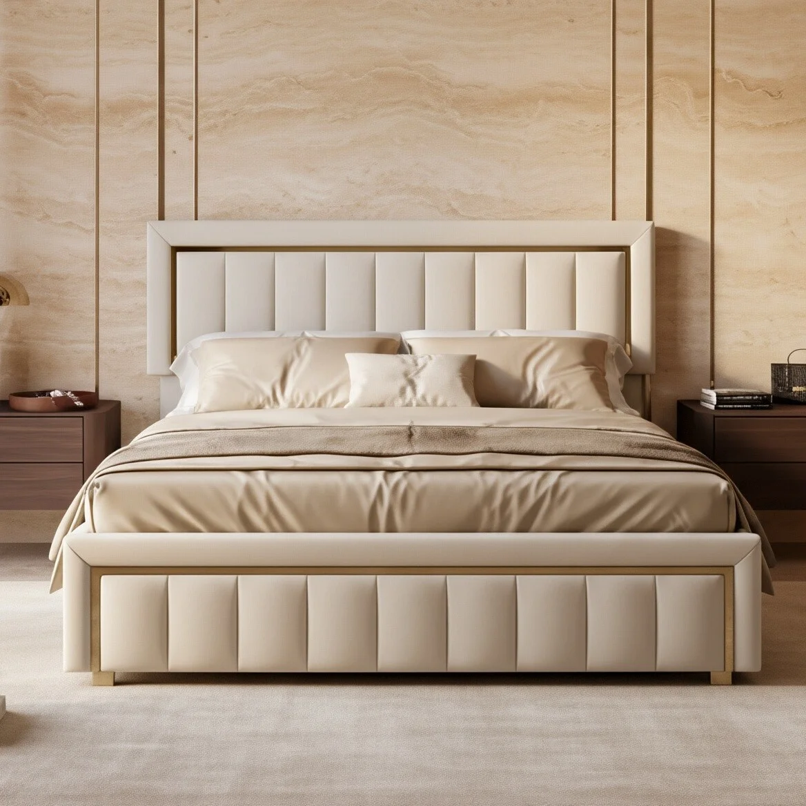 Lit coffre - 140/160x200 cm - Rangement Hydraulique - Finition Dorée & Coutures Verticales - Sommier Inclus - Velours Beige