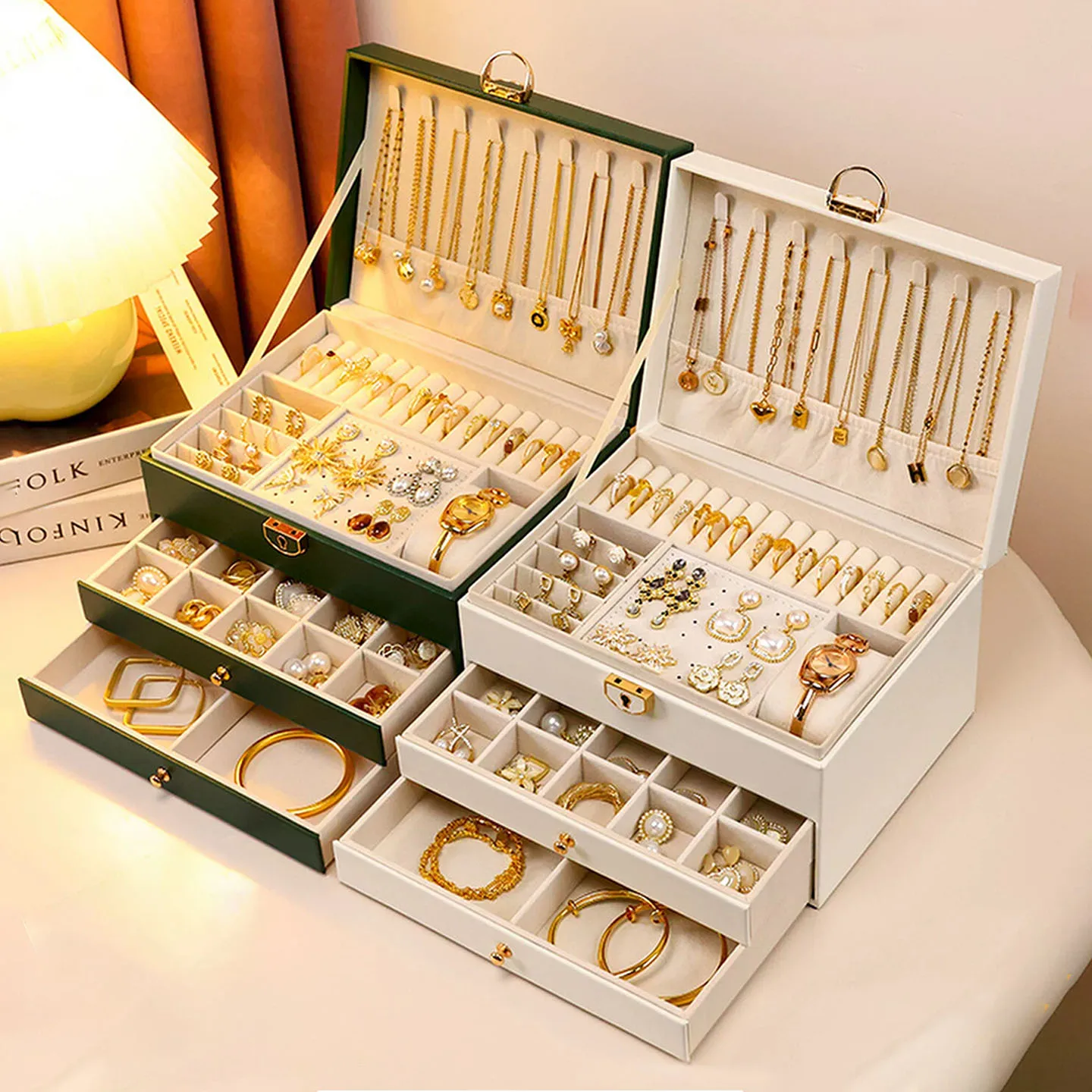 Boîte à bijoux à 3 niveaux avec 2 tiroirs, mallette de rangement de bijoux en cuir PU, idéale pour organisateur de colliers, bracelets, bagues et boucles d'oreilles