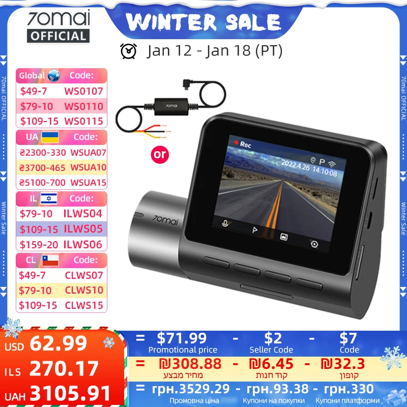 70mai-Caméra avant DVR de voiture avec vision nocturne, caméra de tableau de bord Pro Plus, GPS intégré, prise en charge WiFi, caméra arrière, enregistreur A500S, 1944P