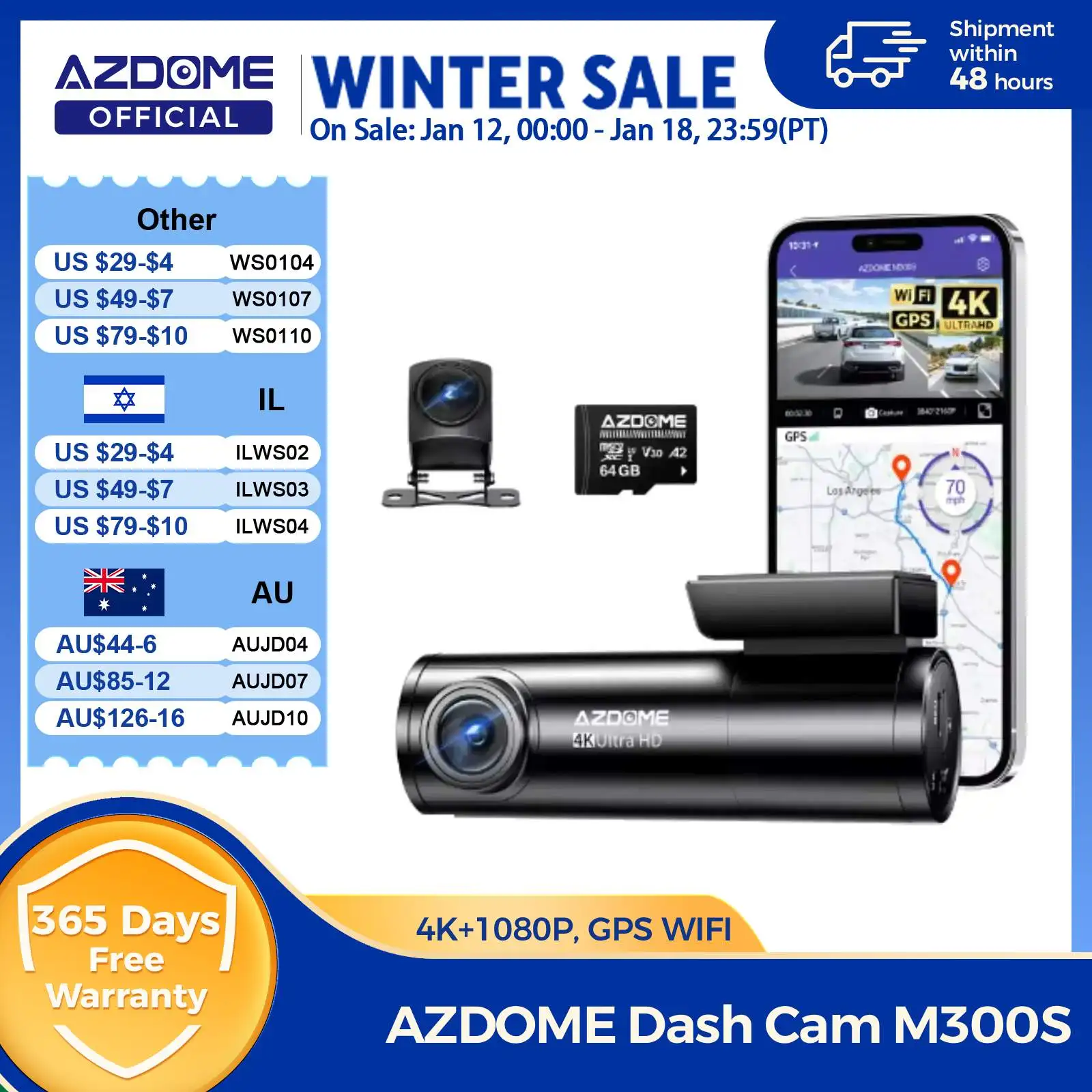 AZDOME-Caméra de tableau de bord M300S, caméra arrière de voiture, objectif 800MP, GPS intégré, WiFi, DVR, commande vocale, vision nocturne, 4K + 1080P