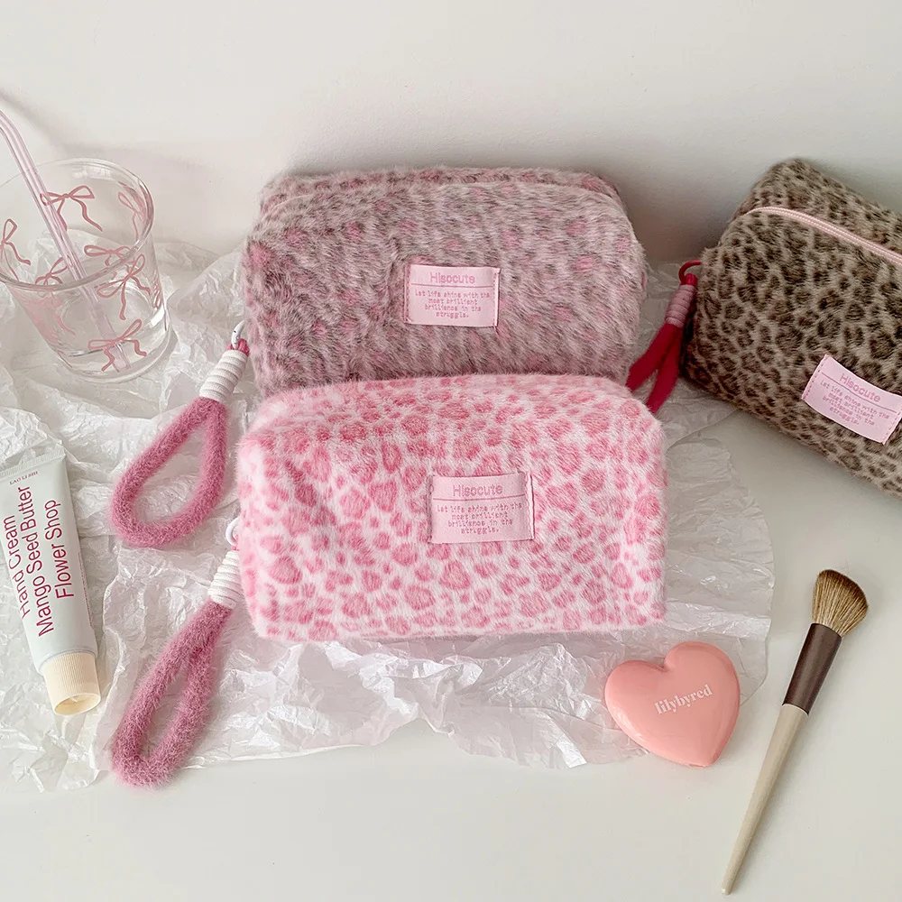 INS mode coréenne hiver en peluche motif léopard sac de maquillage Portable rouge à lèvres sac de rangement filles femmes étudiant trousse à crayons
