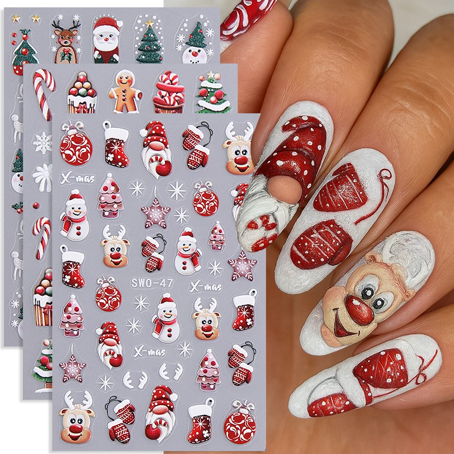 Autocollants pour ongles en relief de noël, bonhomme de neige, pain d'épice, gants flocon de neige, décalcomanies pour ongles, fournitures de décoration d'hiver, DIY bricolage, 2/3 pièces