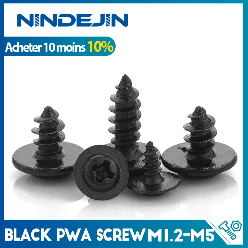 NINDEJIN matériel vis noire PWA croix tête ronde avec coussin vis autotaraudeuse tête cylindrique M1.4 M1.7 M2 M2.3 M2.6 M3 M3.5 M4