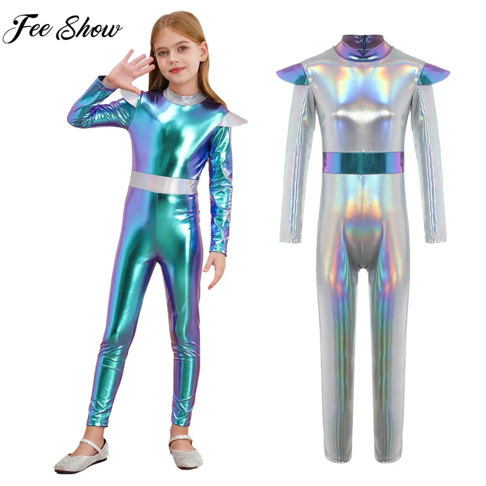 Costume de Cosplay Alien pour enfants, combinaison métallique brillante à manches longues, fête à thème, carnaval, body de spectacle