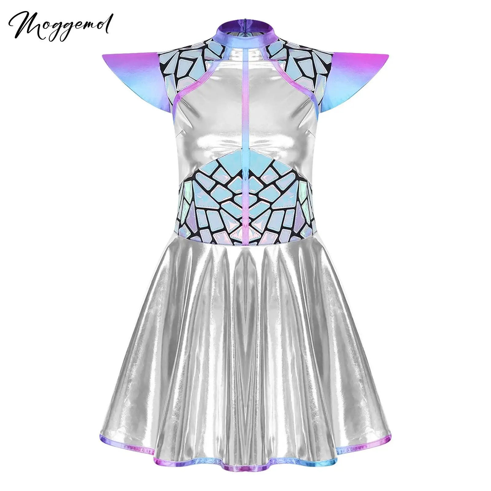 Robe d'astronaute extraterrestre pour femmes, Mini robe trapèze à paillettes dégradées, métallique brillant, Patchwork, manches volantes, pour soirée sur le thème du Club