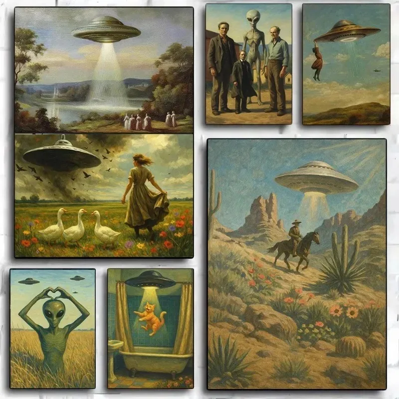 UFO vitorien paysage Art impression Alien Invasion Vintage science-fiction affiche rétro futuriste surréaliste décoration murale salon bureau