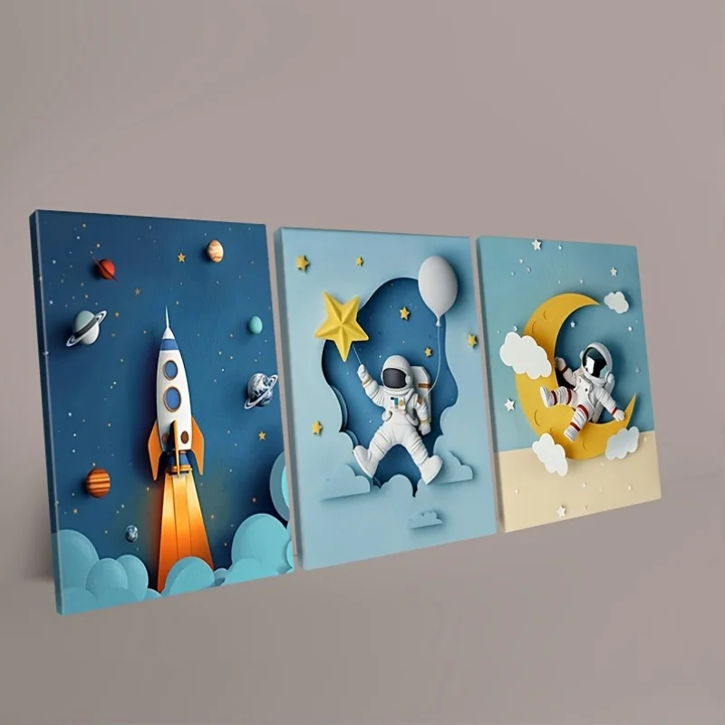 [2D plat] Ensemble d'art mural d'astronaute spatial encadré à 3 panneaux – Impressions sur toile modernes sur le thème de l'espace avec fusée, astronaute et planètes – Vib