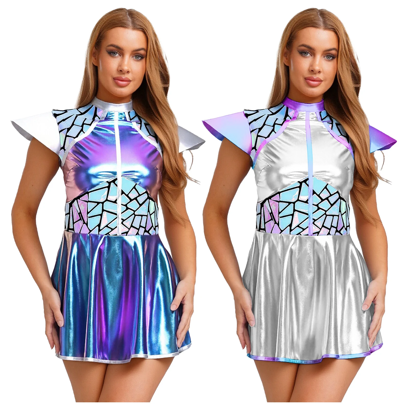 Costume de Cosplay Robot astronaute extraterrestre pour femmes, robe trapèze à paillettes métalliques brillantes à manches volantes pour Halloween Rave discothèque