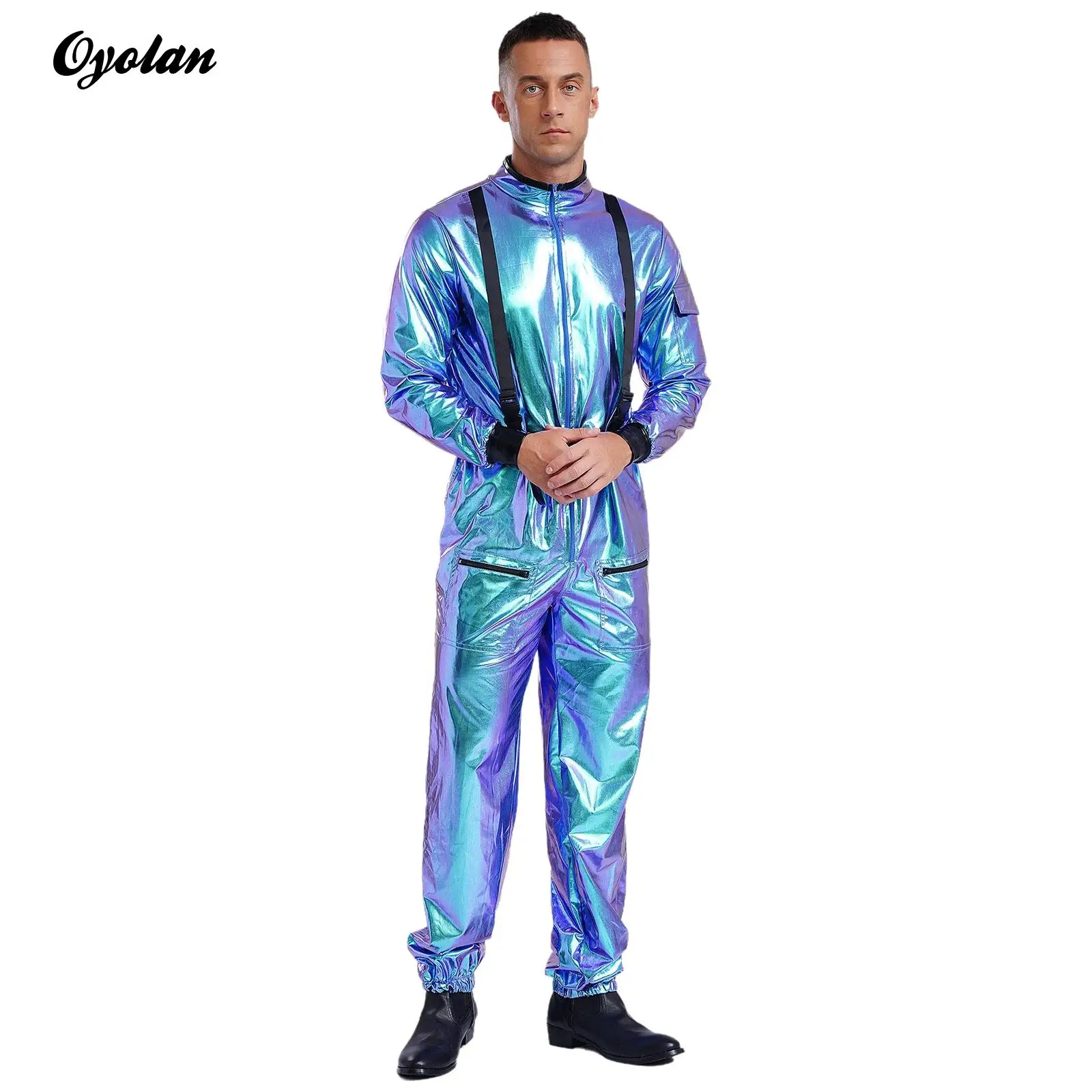 Costume de cosplay d'astronaute, pilote, force aérienne, extraterrestre pour homme, combinaison de robot disco à manches longues, brillante et métallisée, combinaison à fermeture éclair