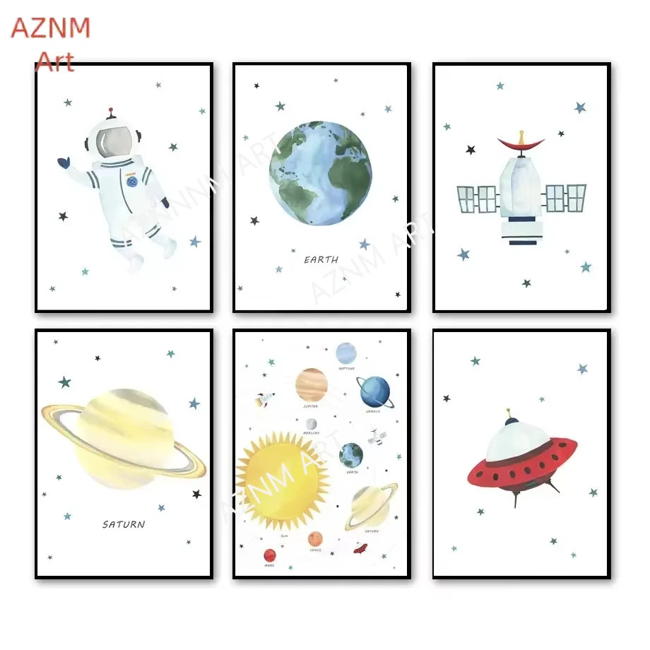 Toile murale personnalisée avec le nom de l'astronaute, la station spatiale, les planètes, la fusée, la Terre, Saturne, images pour la maison, affiches pour la chambre d'enfant, impressions, décoration de la chambre