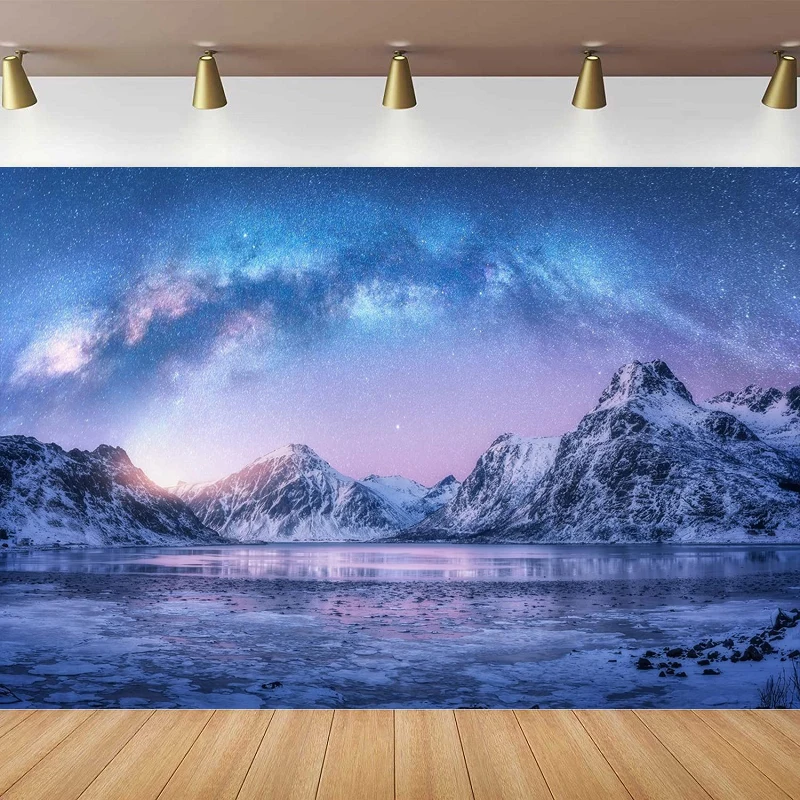 Norvège arctique photographie toile de fond neige montagne lac vue univers espace nuit ciel étoile paysage bleu galaxie fond bannière