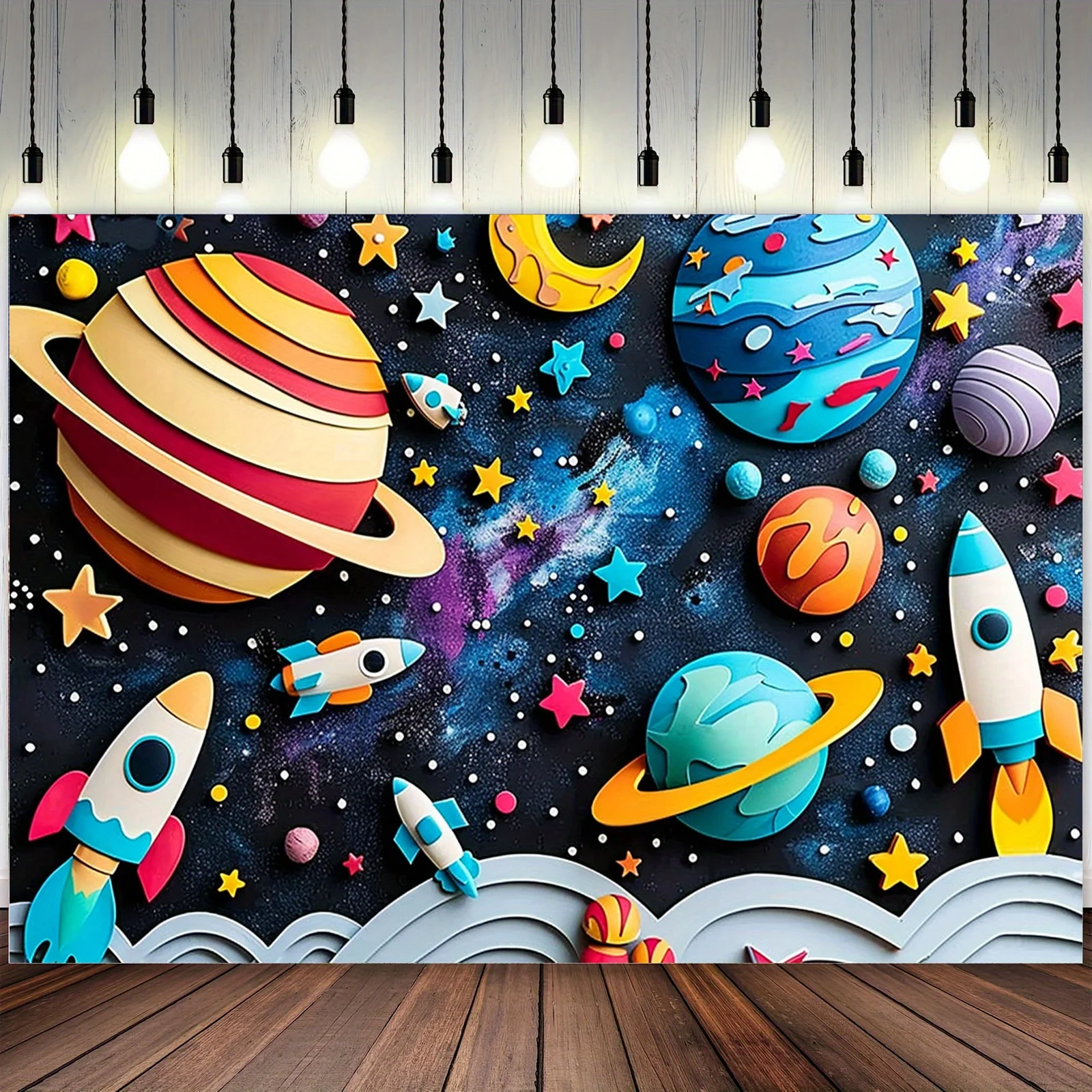 Bannière d'anniversaire 1 pièce – Fond polymère avec planètes, fusées et astronautes, design ciel étoilé vif pour fêtes et événements