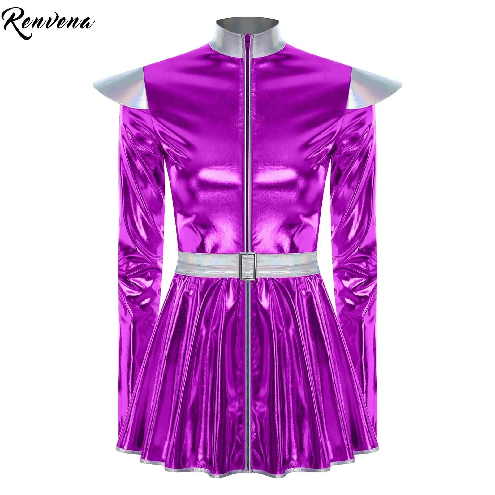 Costume d'halloween Alien pour femmes, Robot de l'espace, robe de soirée sur le thème, métallique brillant, manches longues et ceinture, déguisement fantaisie