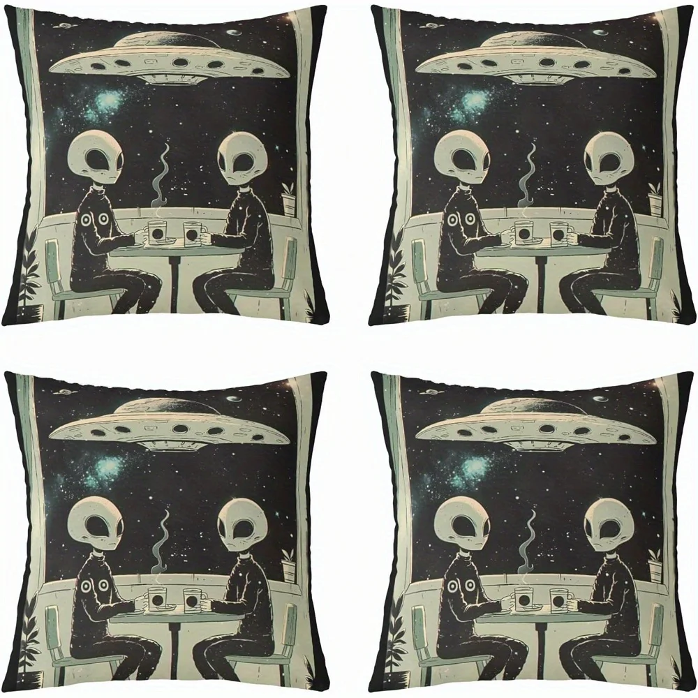 Housse de coussin à motif d'extraterrestres, décoration d'intérieur, réunion au café dans l'espace, adaptée au canapé, une chambre à coucher ou une voiture