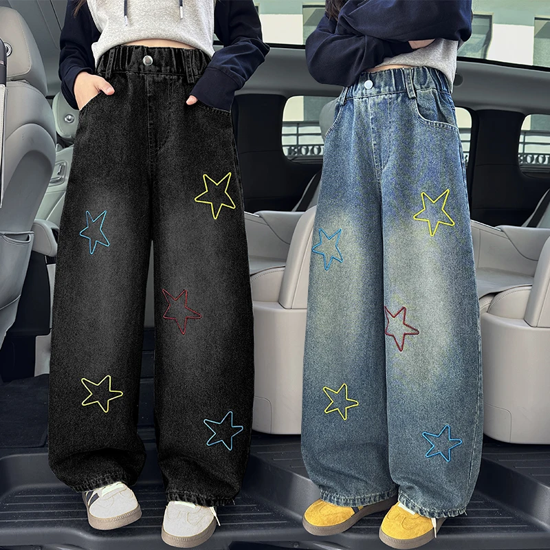 Jeans pour filles, taille haute, ample, Style décontracté, vêtements pour enfants, pantalons de printemps et d'automne, pantalons en Denim étoiles à jambes larges