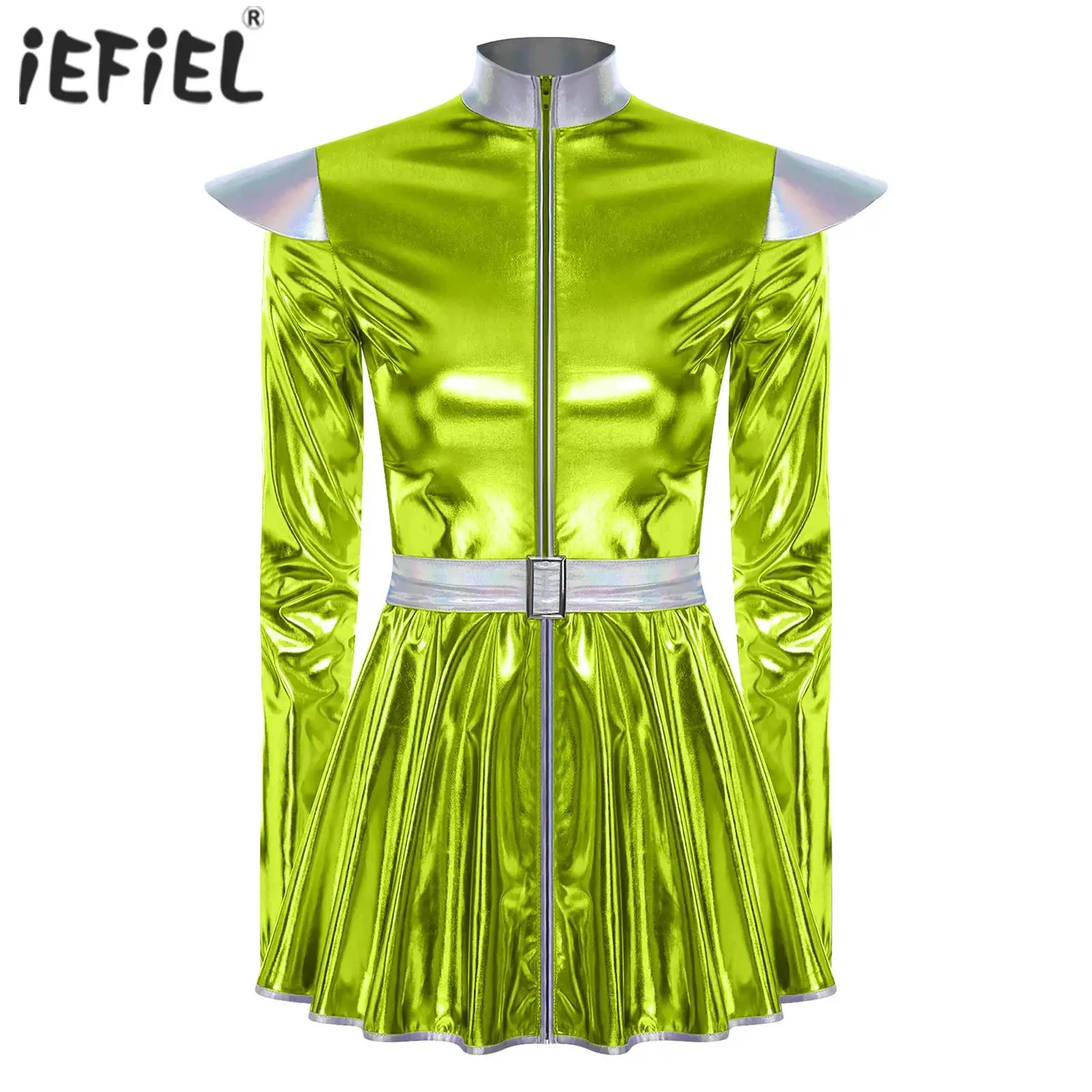 Costume de Cosplay Robot Alien pour femmes, robe trapèze à manches longues avec fermeture éclair sur le devant et ceinture, Costume d'extraterrestre métallique brillant