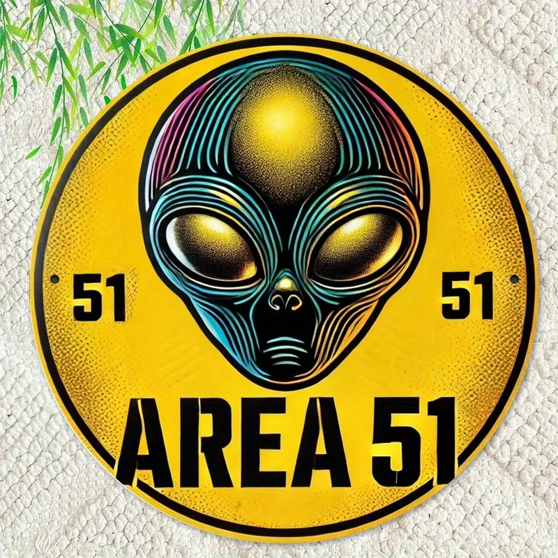 Une plaque circulaire rétro en bois, « Alien Sign for Zone 51 », une décoration murale vintage, idéale pour la décoration intérieure.