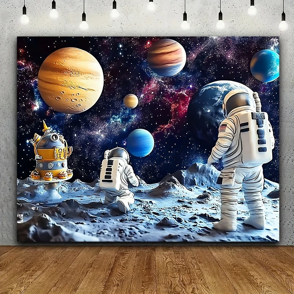 Bannière d'anniversaire 1 pièce – Fond polymère avec planètes, fusées et astronautes, design ciel étoilé vif pour fêtes et événements