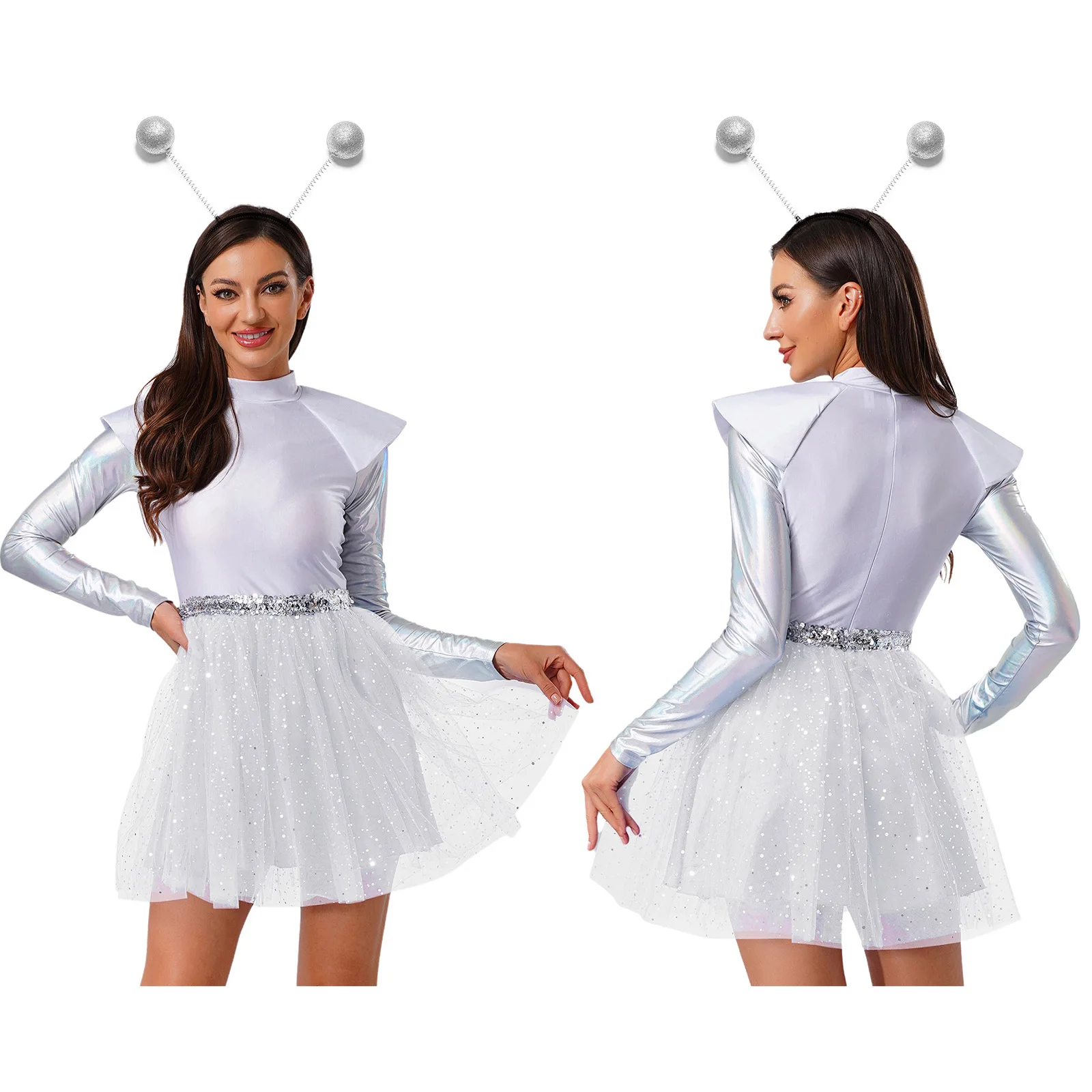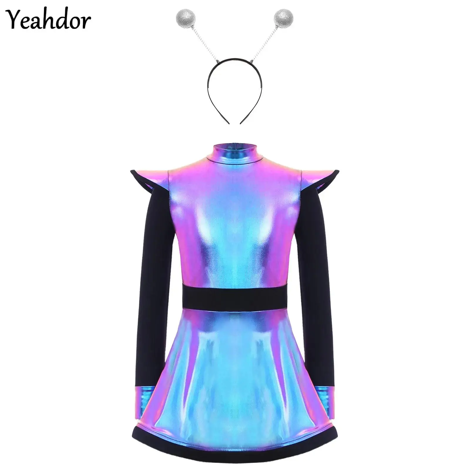 Costume de l'espace extérieur alien brillant métallique pour filles, robe Tutu à manches longues et col zippé, cerceau pour cheveux, pour fête du monde futur d'halloween