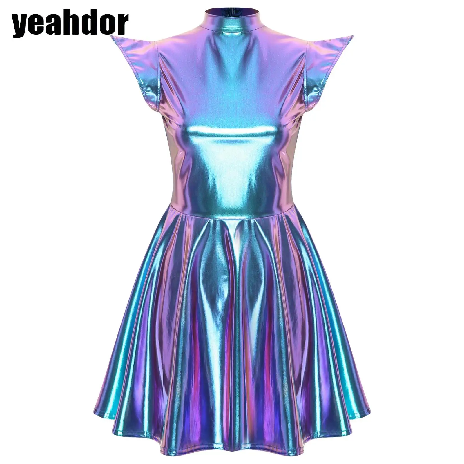 Robe holographique d'halloween pour femmes, métallique brillant, taille haute, ligne a, Festival de musique, astronautes, jeu de rôle extraterrestre