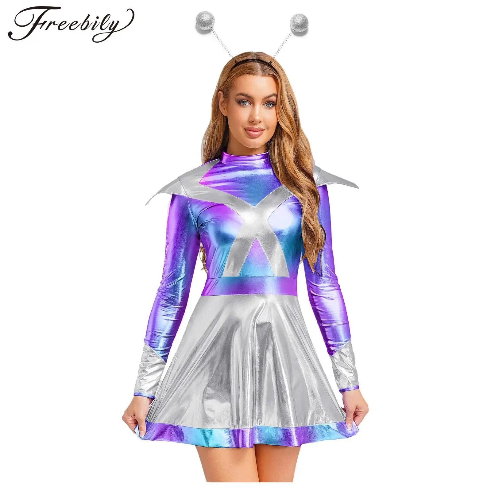 Costume d'extraterrestre pour femme, robe holographique robotique métallique avec bandeau, costume de cosplay spatial pour femme pour Halloween, carnaval