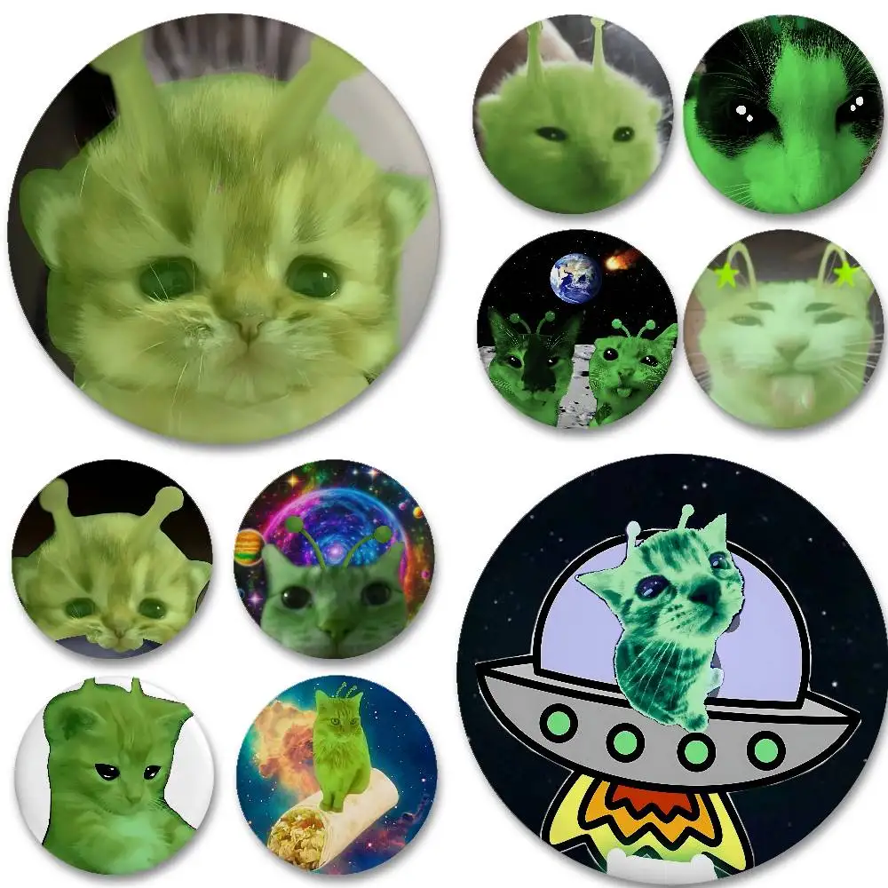 Badge en métal mignon Alien Chat Vert, épinglette souple en fer blanc, accessoires de bijoux personnalisés pour chapeau, sac, revers