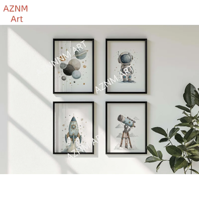 Ensemble d'art mural spatial composé de 4: imprimés de planètes et de télescopes d'astronautes de fusée neutre, décor de pépinière de l'espace, 1/4 pièces