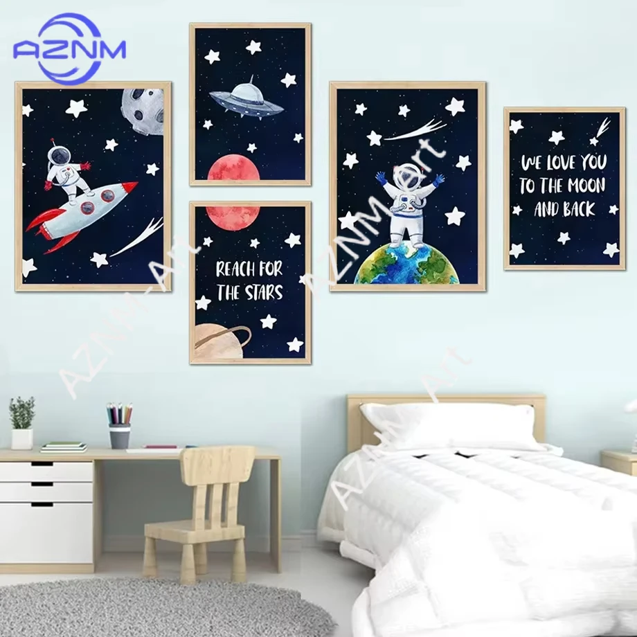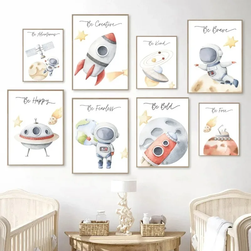 Peinture sur toile fusée astronaute ovni espace planète étoile pépinière Art mural affiches et imprimés nordiques images murales chambre d'enfants Dec
