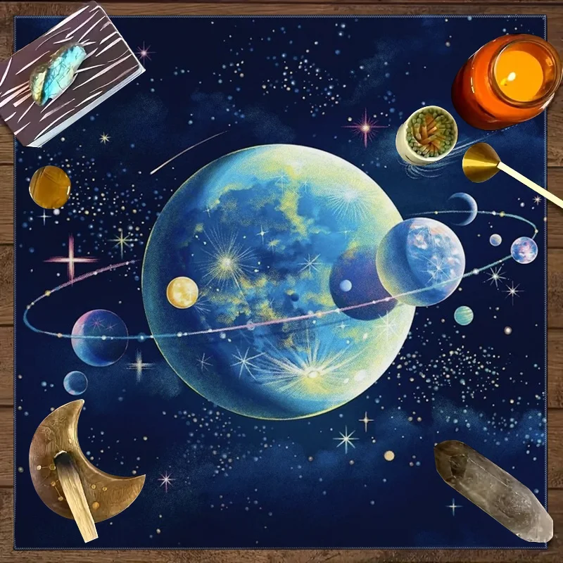 1 pièce Nappe de Tarot et de Présentation Mystique à Imprimé Galaxie, avec Planètes Orbitantes Colorées et Étoiles Cosmiques, pour la Divination et les Fêtes à Domicile