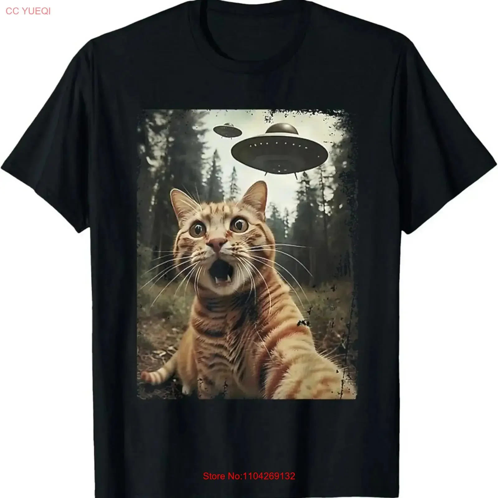 T-shirt humoristique vintage lavé pour homme, motif chat selfie avec OVNI, streetwear, doux, polyvalent, unisexe, mode