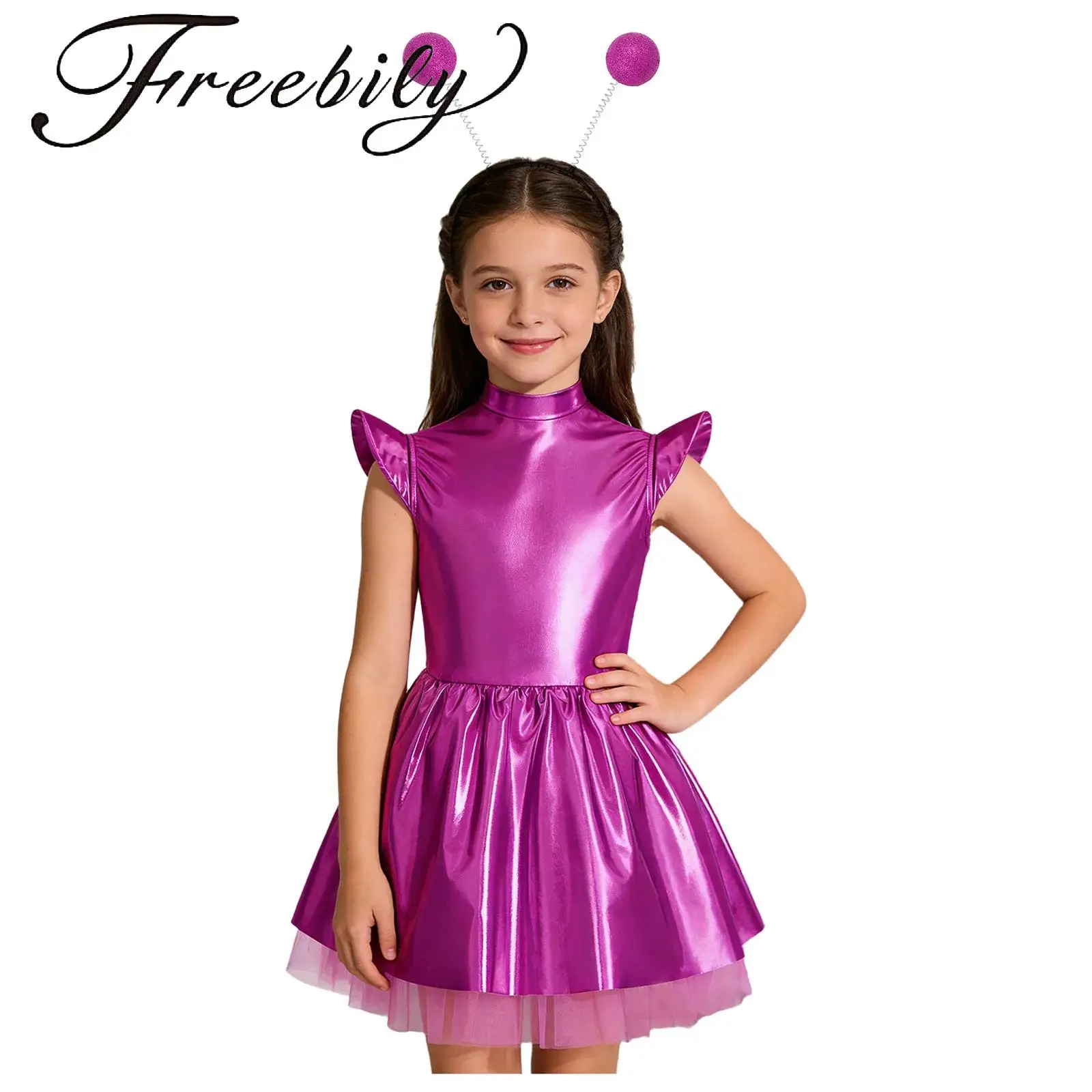 Robe tutu irisée brillante à manches volantes avec fermeture éclair invisible et volants pour filles, avec bandeau pour cheveux, idéale pour les fêtes à thème et les spectacles
