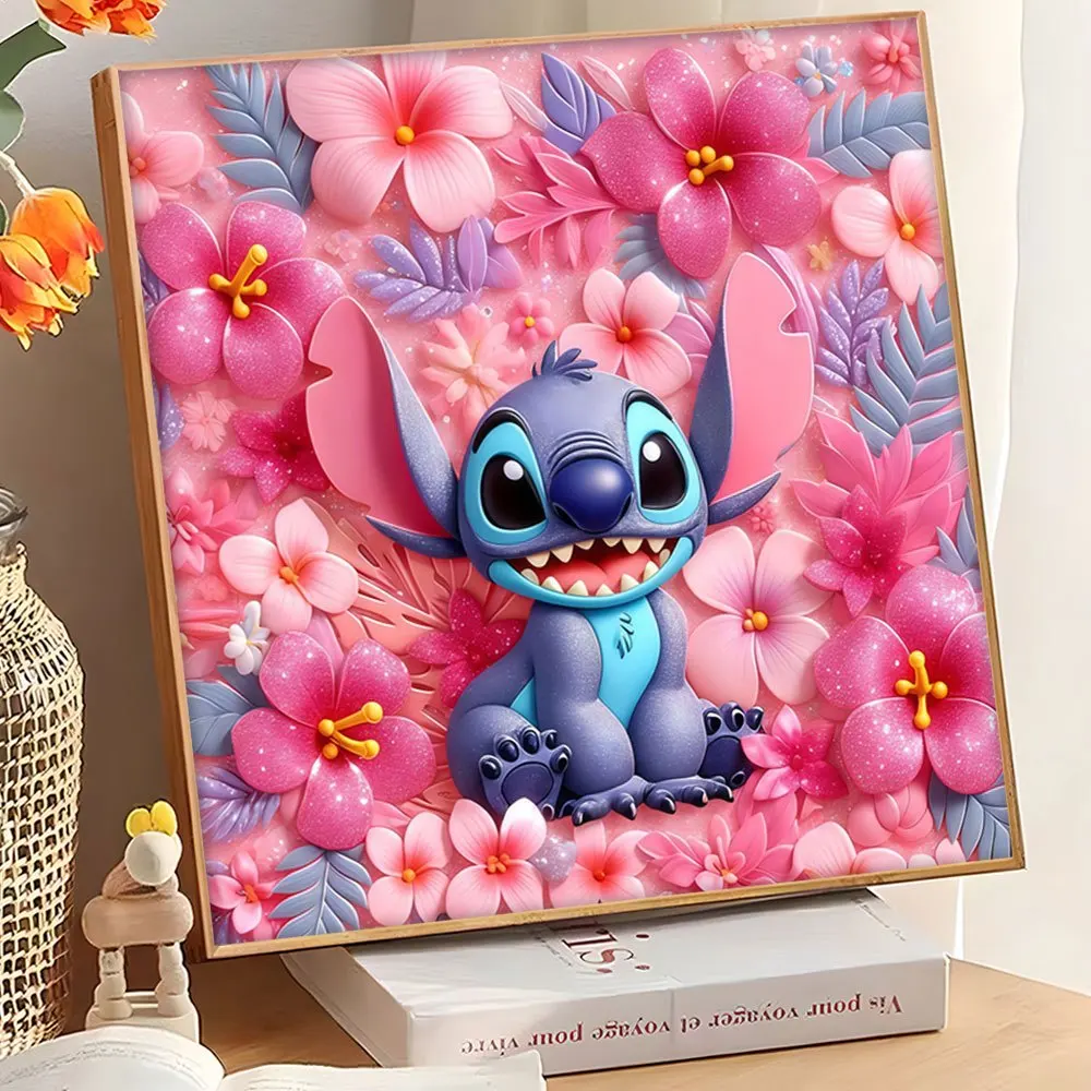 1 ensemble de peinture artistique diamant Disney 5D | Lilo & Stitch sur les fleurs d'hibiscus scintillantes roses et violettes, motif floral extraterrestre de dessin animé