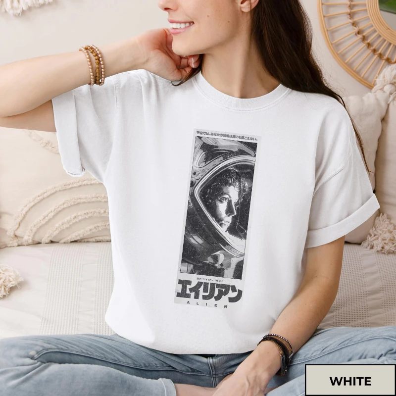 T-shirt à manches courtes de couleur confortable de science-fiction japonaise pour les quatre saisons des femmes, T-shirt de film alien rétro 1979