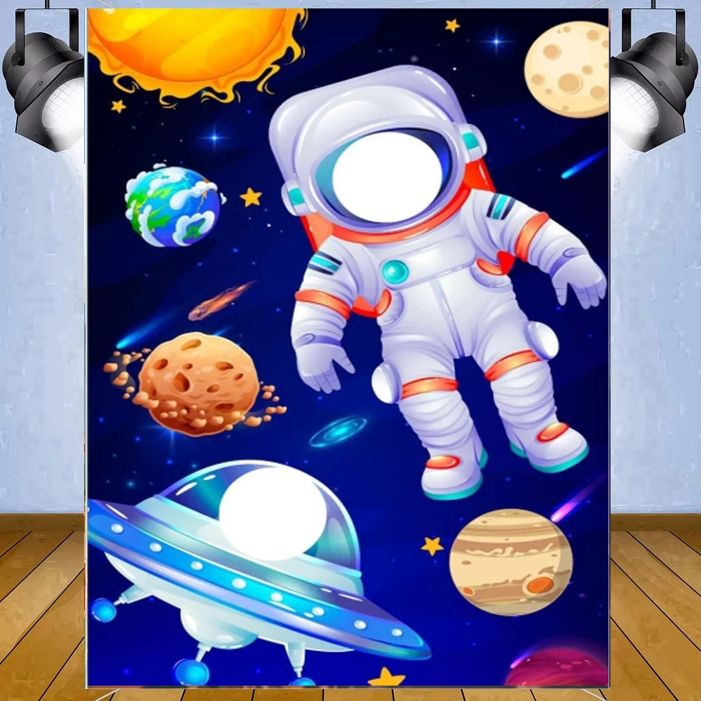 Toile de fond pour fête dans l'espace, astronaute, visage extraterrestre, arrière-plan découpé, fusée, galaxie, étoile, bannière, décor de fête d'anniversaire
