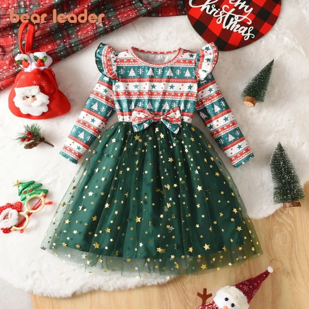 Bear Leader 2025 vacances vêtements pour enfants automne à manches longues nœud Patchwork étoile maille filles robes robe d'arbre de noël