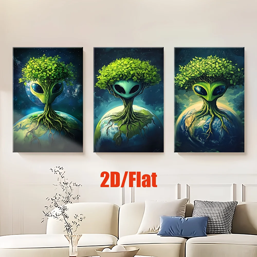 Art mural sur toile sans cadre 2D plat 3 pièces - Arbre extraterrestre aux yeux ouverts et toile de fond planétaire, Affiches abstraites de science-fiction pour salon, O
