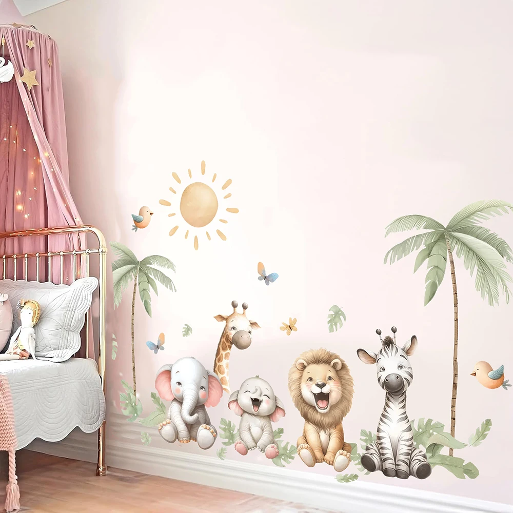Autocollants muraux animaux aquarelle Jungle Safari, Lion, éléphant, zèbre, palmier Tropical, sparadrap muraux pour chambre à coucher, salle de jeux, décoration de maison
