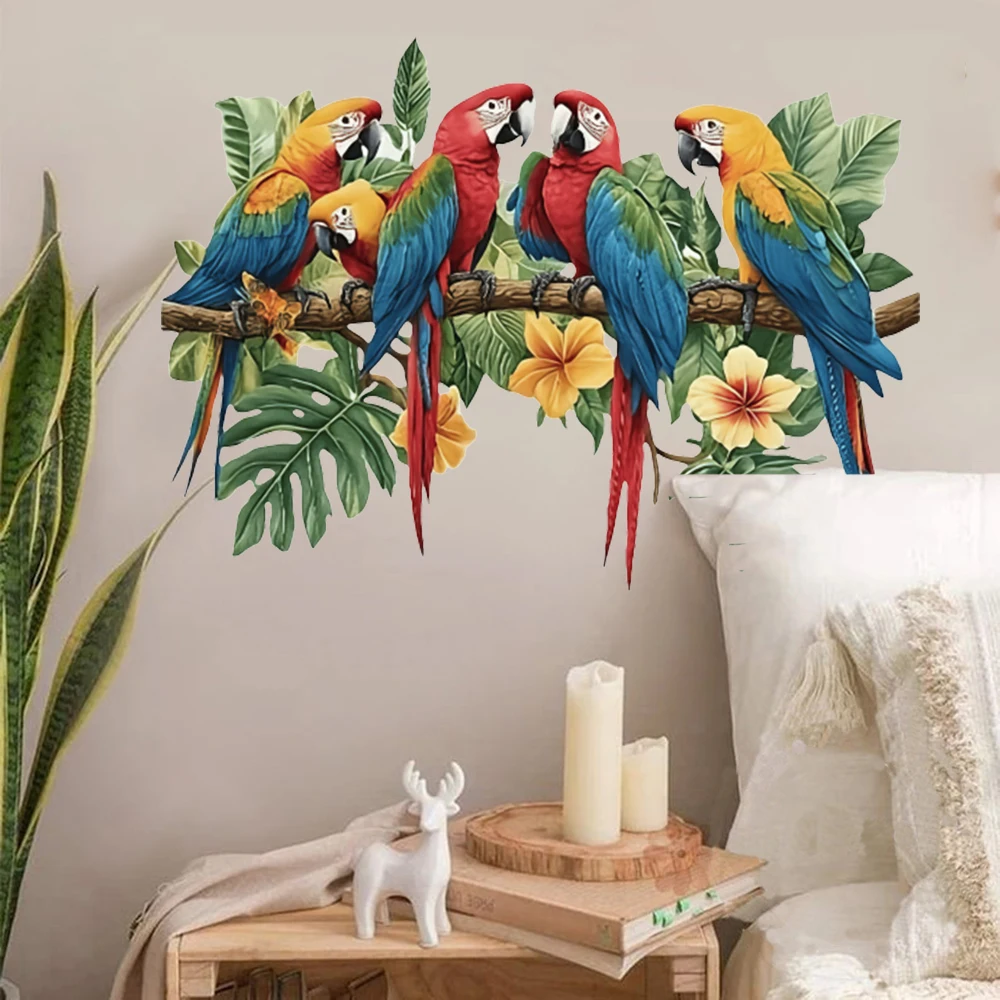 Autocollants muraux perroquets sur branche, 3 pièces, pour chambre à coucher, salle de jeux, feuillage Tropical vibrant, autocollants muraux pour oiseaux, pépinière de bébé, salon