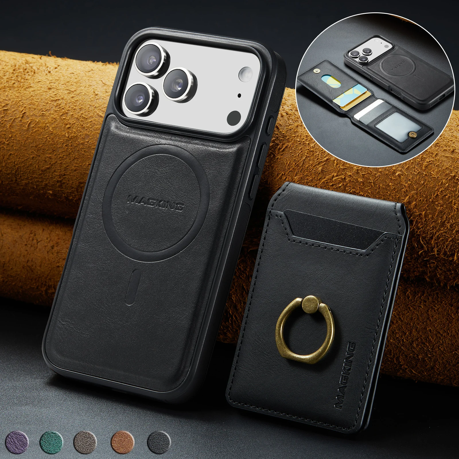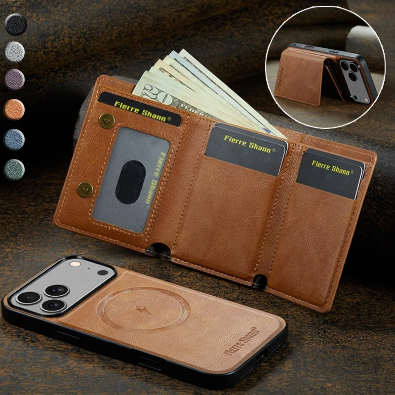 Étui portefeuille en cuir à rabat pour iPhone 17 Air 16 Pro Max 16E 15 Plus 14 13 12 compatible MagSafe avec porte-cartes et anneau de maintien