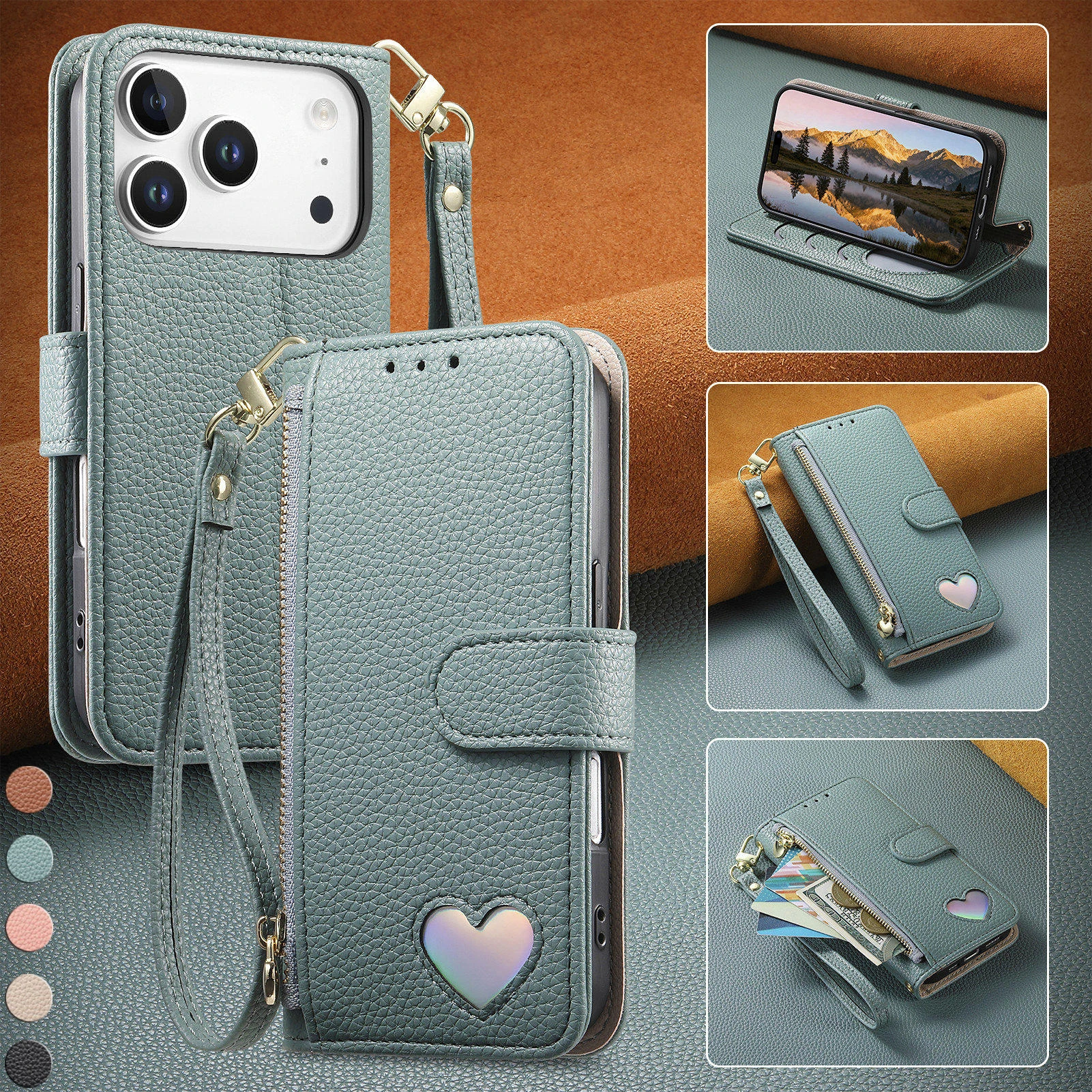 Étui Portefeuille de Luxe en Cuir pour iPhone 17E 17 Air 16E 16 Pro Max 15 Plus 14 13 12 11 avec Emplacements pour Cartes et Compartiment Argent (Funda Coque)