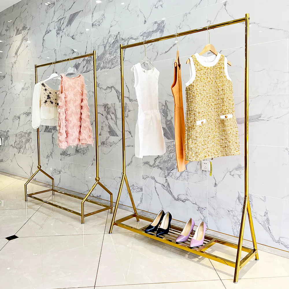 Présentoir de Magasin de Vêtements Portable Moderne en Acier Inoxydable Doré à Barre Unique Robuste pour Présentation de Vêtements
