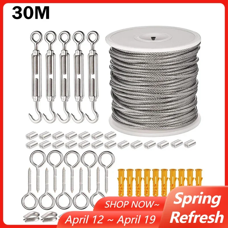 30/15M vezeték kötél Kábel Horog Akasztás Ruhaszárító kötél Rozsdaálló Acél Kábel Sátor Kötél készlet kültéri kerti Kábel guardrail tighter beállítása