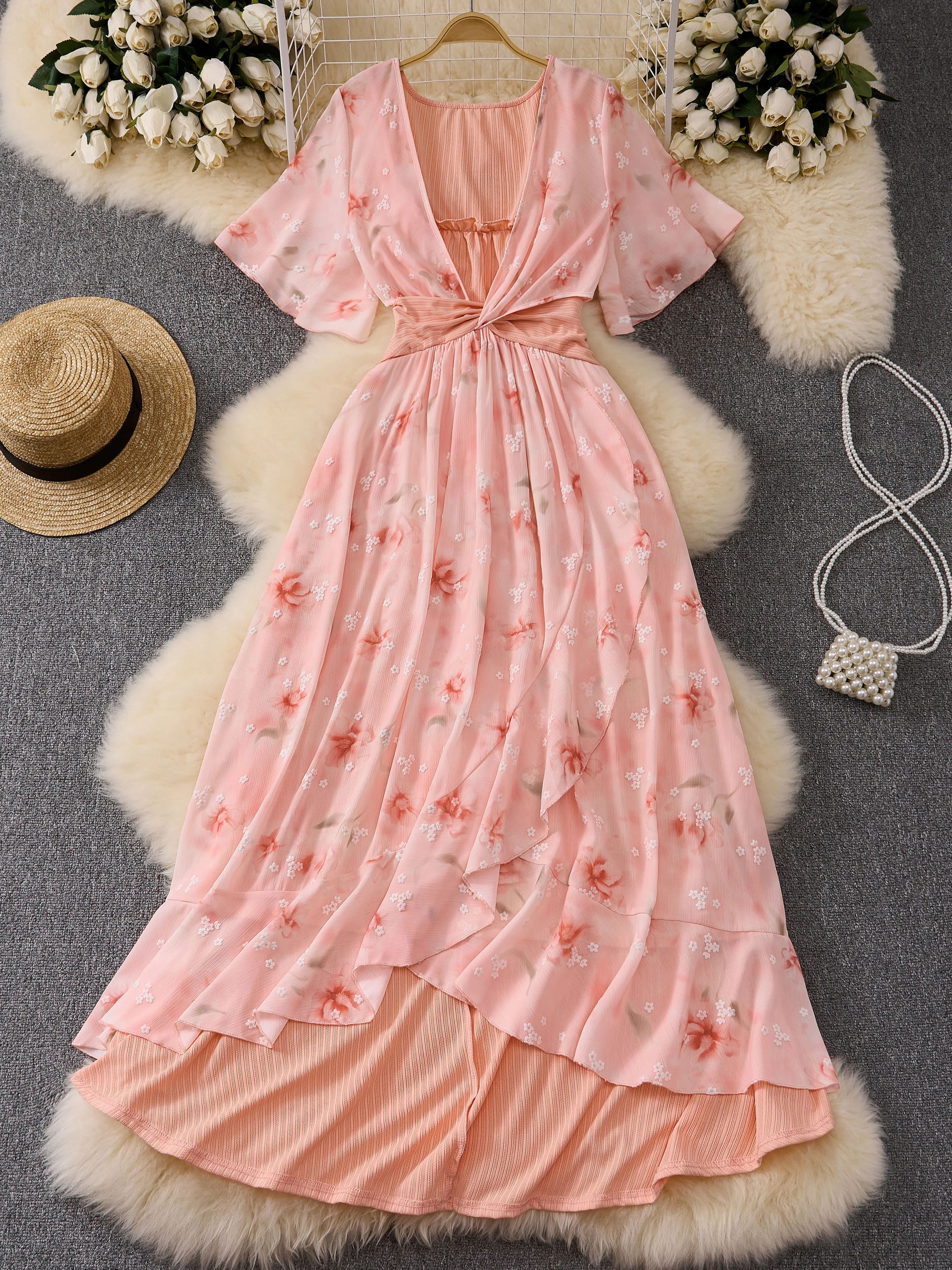 Large-sized Árad vmiből Ősz Új flower-printed ruffled Rakott Cérnázott Felszeg Magas Alacsony ruhát Női Alkalmi maxi ruhát