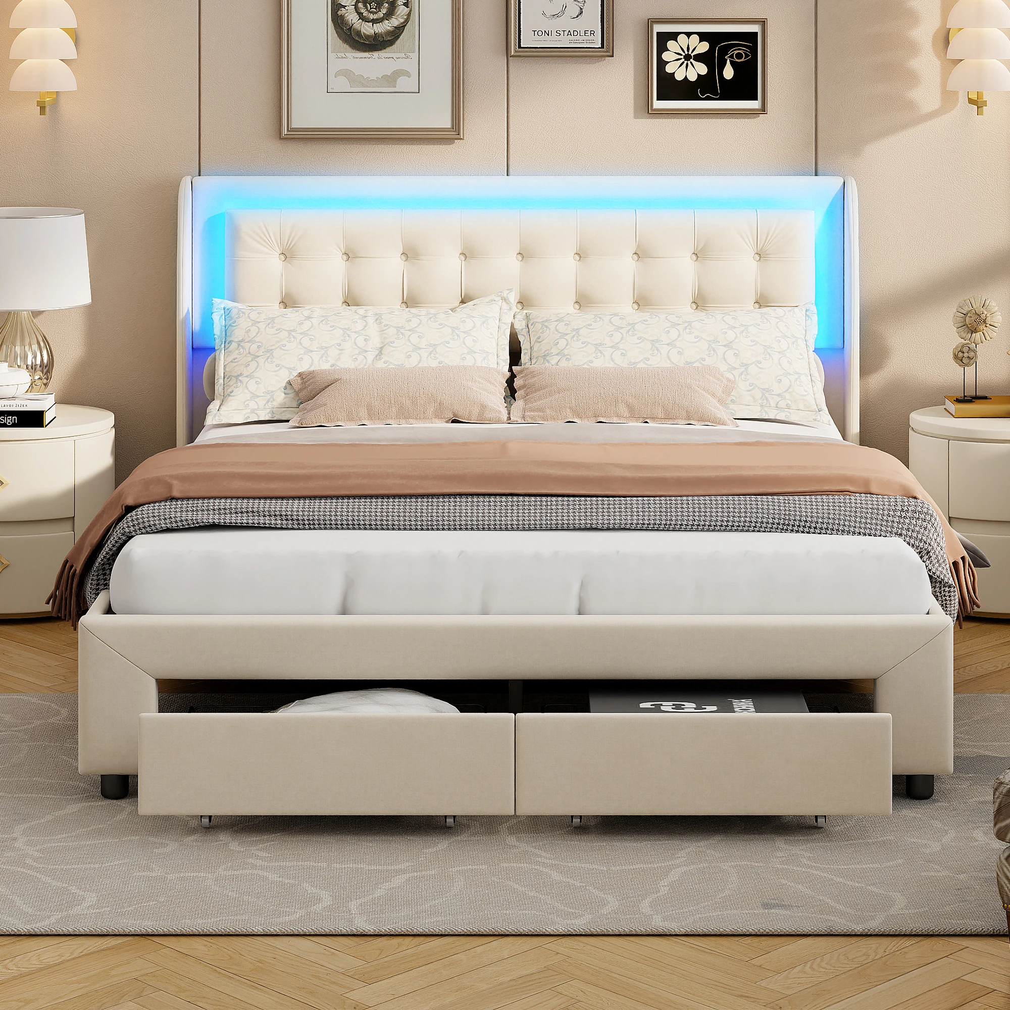 Kárpitozás Ágy 160x200cm Vízépítéstan tárolására Ágy vel subbed Elcsigázott szoba, Dublőz Ágy vel Érzékelő ledes ligh sáv, Bársoly Bézs
