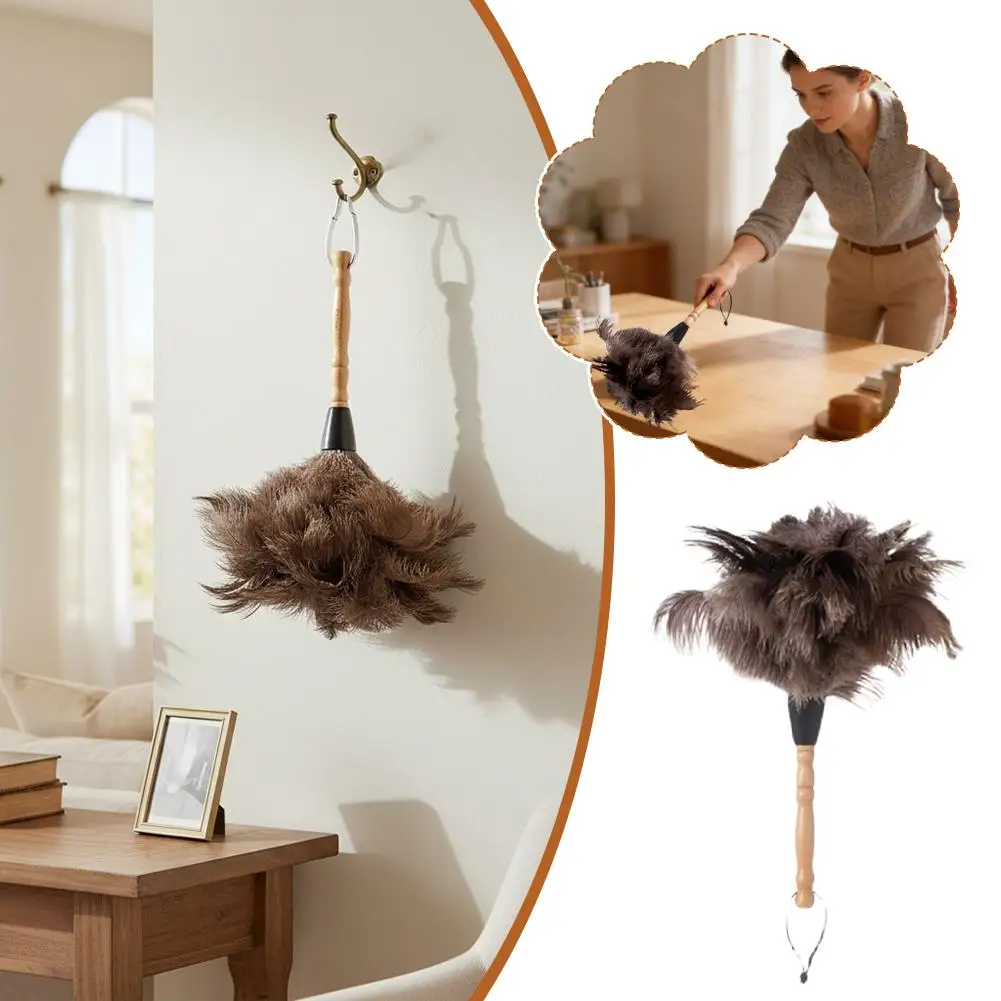 Piumino in Piume di Struzzo con Manico in Legno, Spazzola Antistatica per Rimozione Polvere, Strumento per Pulizia Domestica