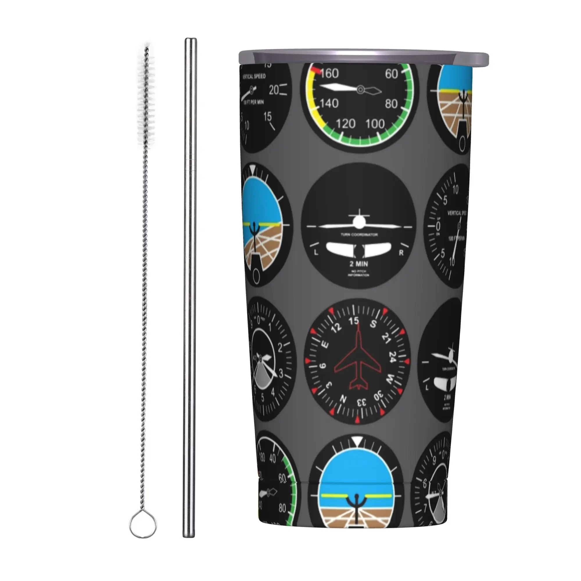 Borraccia Termica Isolante in Acciaio Inossidabile a Doppia Parete con Cannuccia e Coperchio, a Tema Strumenti di Volo Aeronautici