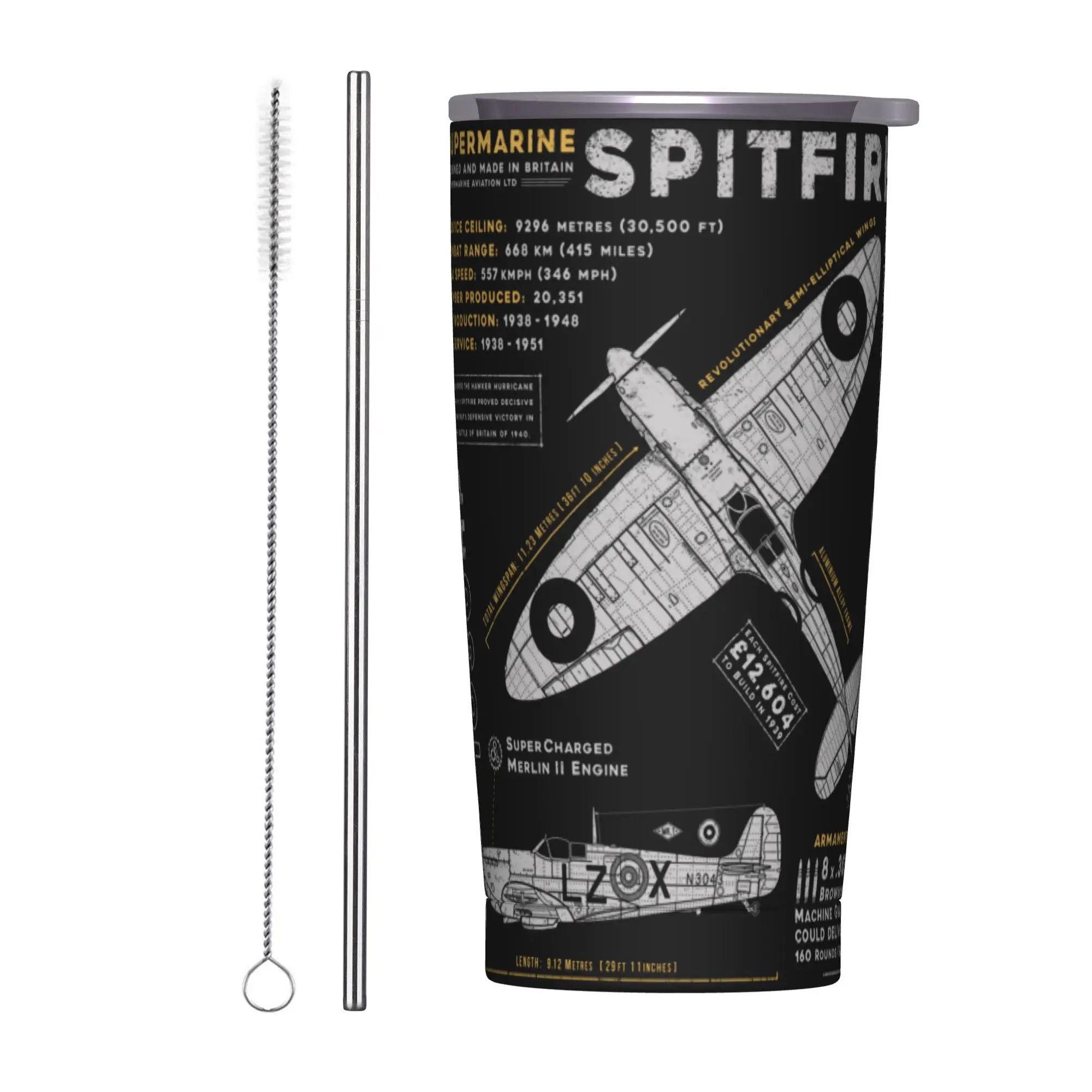 Borraccia Termica Isolante Supermarine Spitfire con Coperchio, Cannuccia e Etichette, Tazza Termica Sottovuoto in Acciaio Inossidabile a Doppia Parete, Bottiglia d'Acqua per Casa 20oz