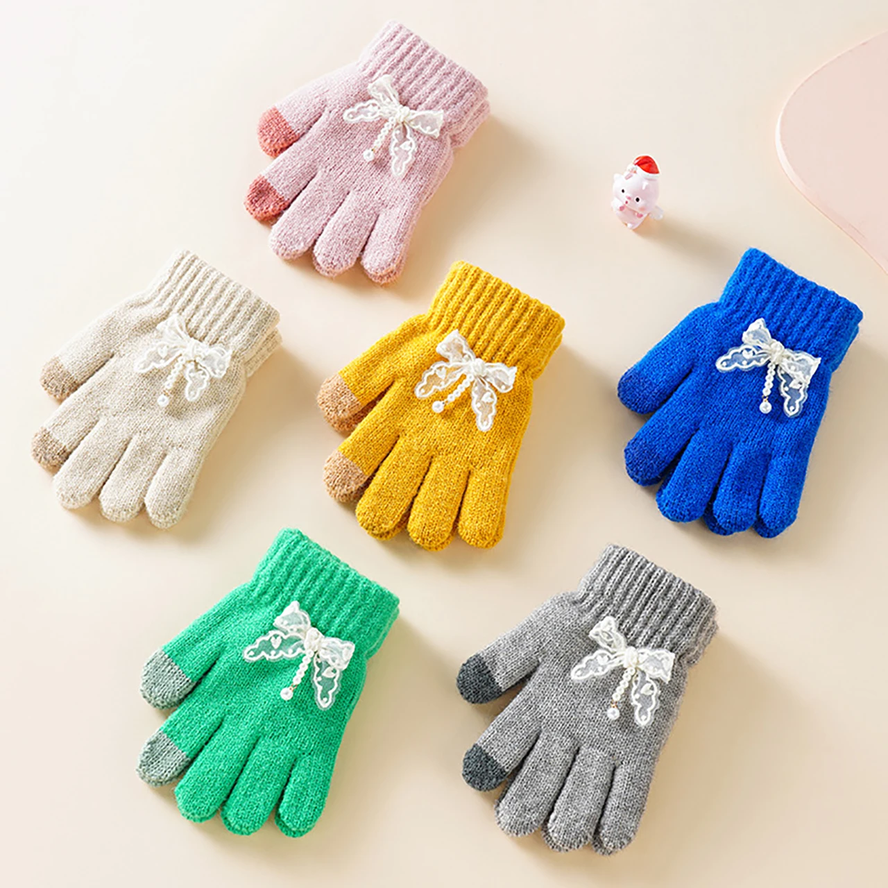 Guanti per ragazze con fiocco in pizzo perlato Guanti invernali caldi per bambini Guanto in maglia 3-6 anni Scaldamani per bambini dolci Guanti a cinque dita Paramani